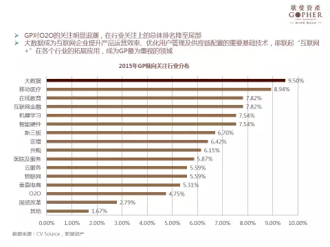 大數(shù)據(jù)成為GP最為重視的領(lǐng)域,移動(dòng)醫(yī)療其次,互聯(lián)網(wǎng)金融、在線教育、智能硬件與機(jī)器學(xué)習(xí)等板塊也成為關(guān)注的重點(diǎn)方向。