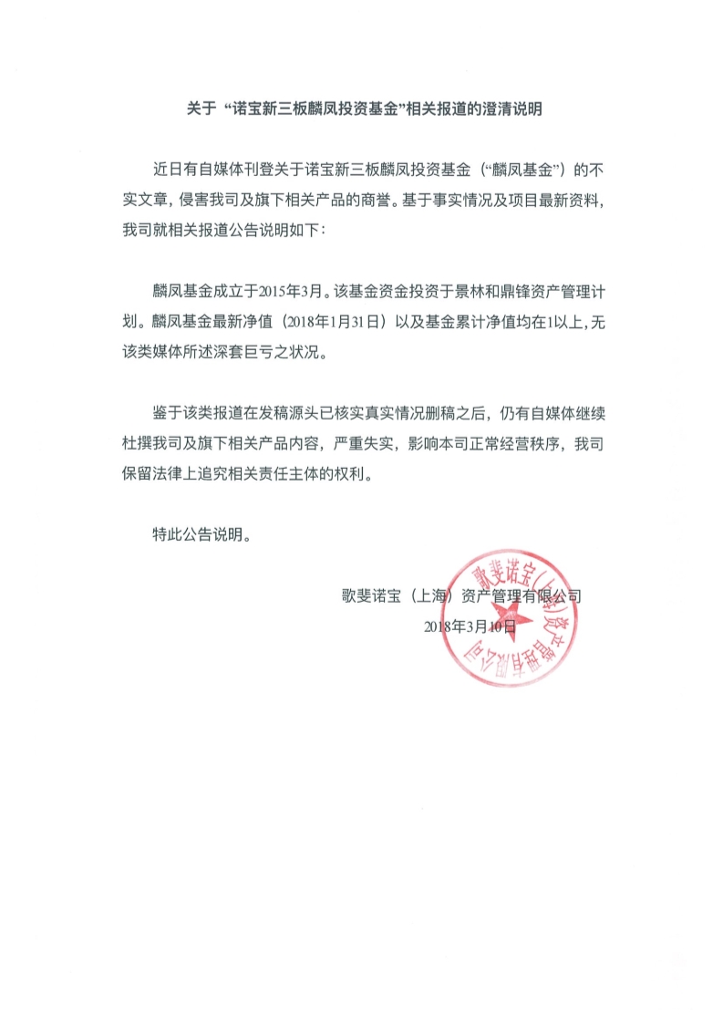 麟鳳基金成立于2015年3月。該基金資金投資于景林和鼎鋒資產(chǎn)管理計(jì)劃。麟鳳基金最新凈值(2018年1月31日)以及基金累計(jì)凈值均在1以上,無該類媒體所述深套巨虧之狀況。 鑒于該類報(bào)道在發(fā)稿源頭已核實(shí)真實(shí)情況刪稿之后,仍有自媒體繼續(xù)杜撰我司及旗下相關(guān)產(chǎn)品內(nèi)容,嚴(yán)重失實(shí),影響本司正常經(jīng)營秩序,我司保留法律上追究相關(guān)責(zé)任主體的權(quán)利。 特此公告說明。 歌斐諾寶(上海)資產(chǎn)管理有限公司 2018年3月10日 公告原文如下: