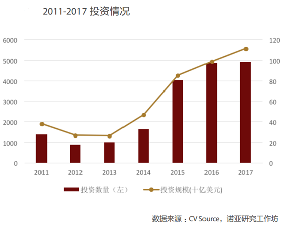 投資環(huán)節(jié),2017年的投資數(shù)量和投資規(guī)模均創(chuàng)新高,連續(xù)五年增長(zhǎng)。