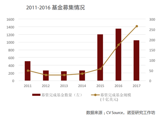 2017年共有1049只私募股權(quán)基金完成募集,募集規(guī)模達(dá)2660.42億美元,雖然基金數(shù)量較2016年有所下降,但是募集規(guī)模卻大幅上升,募資完成基金平均規(guī)模達(dá)到新高。