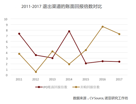投資回報(bào)倍數(shù):2011-2017年間并購(gòu)?fù)顺龅幕貓?bào)水平經(jīng)常高于IPO退出,尤其是近些年并購(gòu)?fù)顺龅幕貓?bào)更是連續(xù)高于IPO退出的回報(bào),這其中一定程度受到了2013和2015年IPO停發(fā)的影響,也有IPO發(fā)行估值水平限制,以及市場(chǎng)行情波動(dòng)的因素。2017年并購(gòu)?fù)顺龅幕貓?bào)倍數(shù)雖然較2016年8.61的高值有所回落,但是仍然錄得了7.29的高回報(bào)水平。隨著政策扶持優(yōu)質(zhì)企業(yè)上市,未來(lái)并購(gòu)?fù)顺鍪欠駮?huì)重新超越IPO退出值得后續(xù)密切關(guān)注。