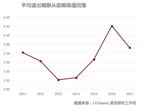 退出期限:自2013年開(kāi)始,PE投資退出期限正逐步上升。這主要是由于2013年IPO重啟后,監(jiān)管力度加大,退出時(shí)間上升。但隨著IPO發(fā)行的逐步常態(tài)化,以及并購(gòu)監(jiān)管的放松,2017年的退出期限已經(jīng)較2016年4.3的高值有所回落。