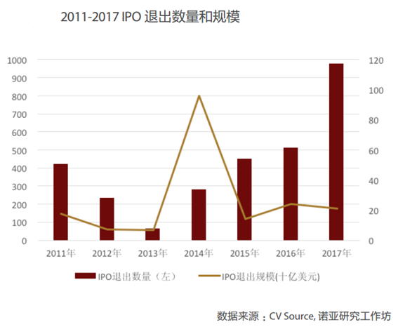 隨著金融監(jiān)管的不斷調(diào)整和改革進(jìn)步,IPO發(fā)行日益市場(chǎng)化、常態(tài)化,尤其近期中央層面明確出臺(tái)政策,支持四大行業(yè)獨(dú)角獸企業(yè)上市。這對(duì)于私募股權(quán)投資行業(yè)來(lái)說(shuō)無(wú)疑是一項(xiàng)利好的消息。受到政策利好等因素的共同影響,2017年IPO退出數(shù)量較2016年有大幅提升,但由于獨(dú)角獸類型的新興或細(xì)分行業(yè)龍頭較少,因此退出規(guī)模較2016年有小幅回落。而受益于監(jiān)管的調(diào)整與放松,并購(gòu)?fù)顺鲈跀?shù)量和規(guī)模兩方面都較2016年有顯著提升。