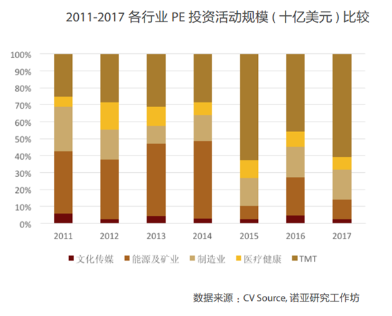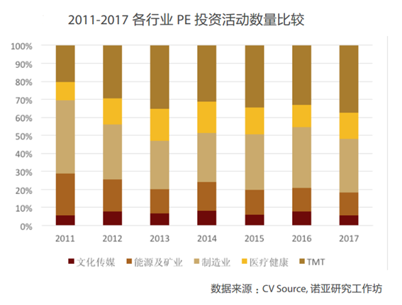 PE投資方面,從投資數(shù)量和投資規(guī)模來(lái)看,TMT和制造業(yè)依然是投資最為聚焦的兩大領(lǐng)域。而醫(yī)療健康則成為了2017年投資增長(zhǎng)最為顯著的行業(yè),成為又一個(gè)投資熱門領(lǐng)域。而在投資規(guī)模方面,TMT依然獨(dú)占鰲頭,制造業(yè)緊隨其后,能源行業(yè)也依然保有較大的投資規(guī)模,位列第三,醫(yī)療健康雖然投資數(shù)量增長(zhǎng)最為顯著,但是總體規(guī)模增長(zhǎng)有限。