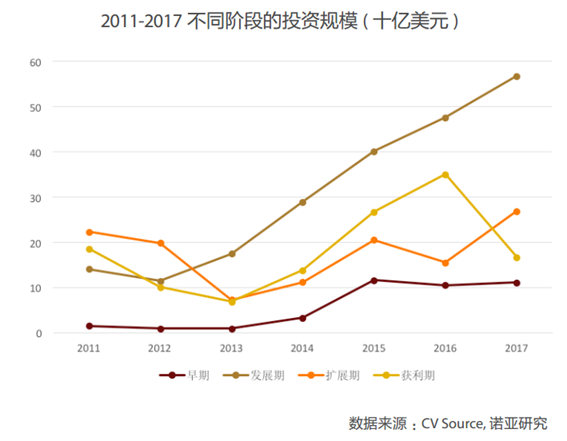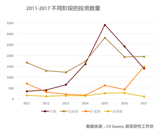 歌斐從數(shù)量和規(guī)模兩個(gè)角度出發(fā),將全市場(chǎng)基金投資項(xiàng)目按照“早期、發(fā)展期、擴(kuò)展期和獲利期”四個(gè)階段進(jìn)行了劃分,可以發(fā)現(xiàn)早期的投資數(shù)量在2017年有所下降,投資早期化的趨勢(shì)有所減弱,而擴(kuò)展期增長(zhǎng)明顯,發(fā)展期則保持相對(duì)穩(wěn)定,投資活躍度依然最高。從投資規(guī)模上來(lái)看,發(fā)展期投資依然是投資的集中區(qū)。