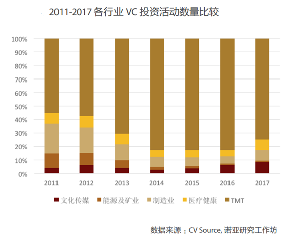 VC投資方面,無(wú)論是從投資數(shù)量還是投資規(guī)模上看,TMT依然獨(dú)領(lǐng)風(fēng)騷。能源及礦業(yè)投資仍然逐步走低,文化傳媒、制造業(yè)和醫(yī)療健康行業(yè)投資穩(wěn)步提升。