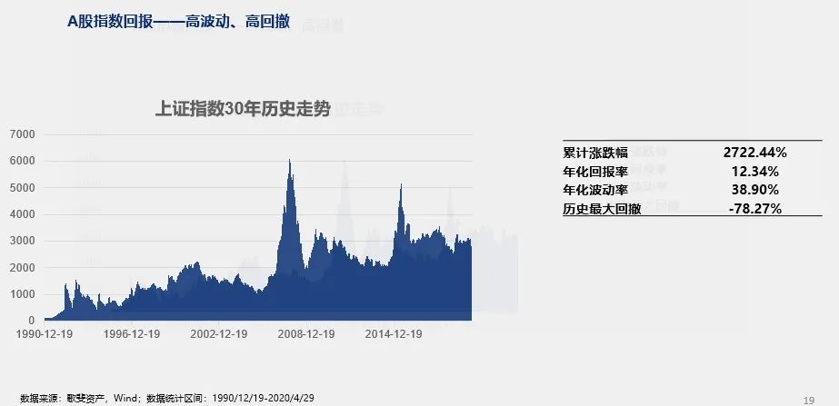 歌斐資產(chǎn)統(tǒng)計(jì)上證指數(shù)30年來歷史走勢數(shù)據(jù)發(fā)現(xiàn),30年來上證指數(shù)年化回報(bào)率超過12%,但年化波動率接近39%,歷史最大回撤達(dá)到-78%,呈現(xiàn)出高波動、高回撤的特性。很有可能一不小心在高點(diǎn)進(jìn)入,就容易被套牢好幾年。
