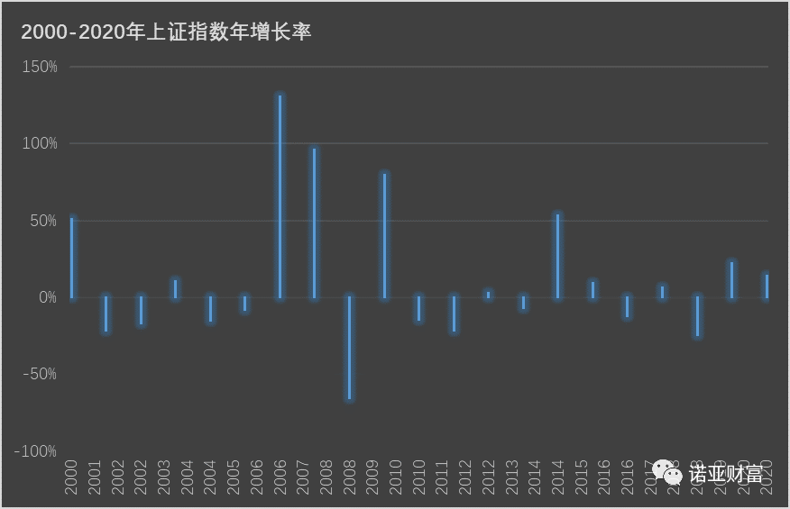 以上證指數(shù)為例,最近20年來其每年的增長率起起伏伏,雖然總體上是持續(xù)斜向上的走勢,但至今為止2007年的6124點、2015年的5178點,仍是不可逾越的高山,當(dāng)前上證指數(shù)只有3600點左右。