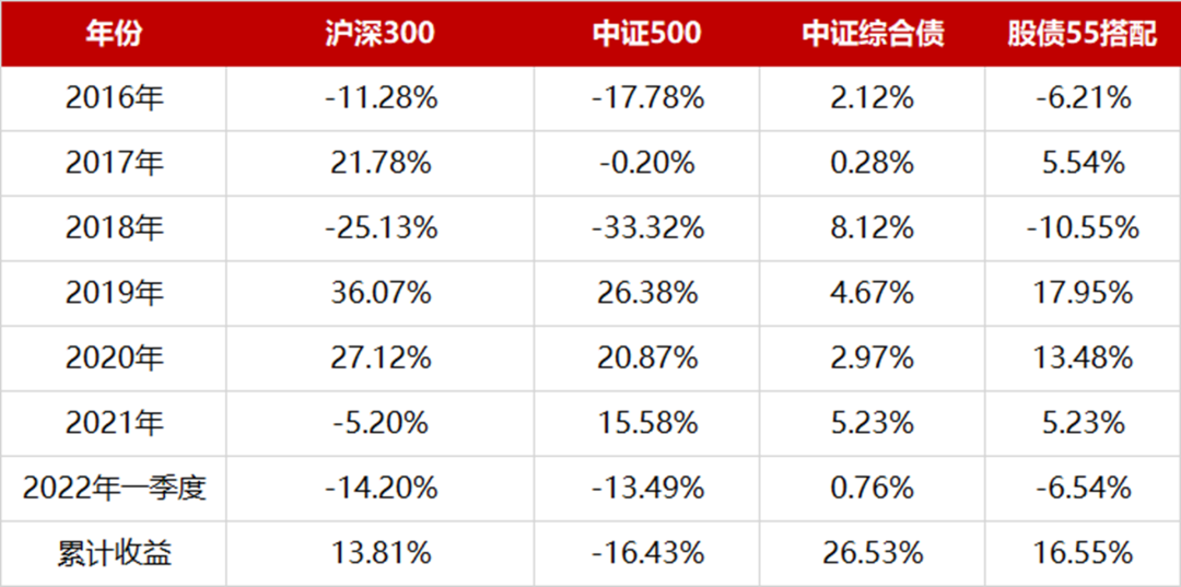 2016年到今年一季度,投資滬深300、中證500、中證綜合債,以及采取股債55搭配(滬深300和中證500各25%,中證綜合債50%)的方式進(jìn)行投資,年度收益和累計(jì)收益如下: