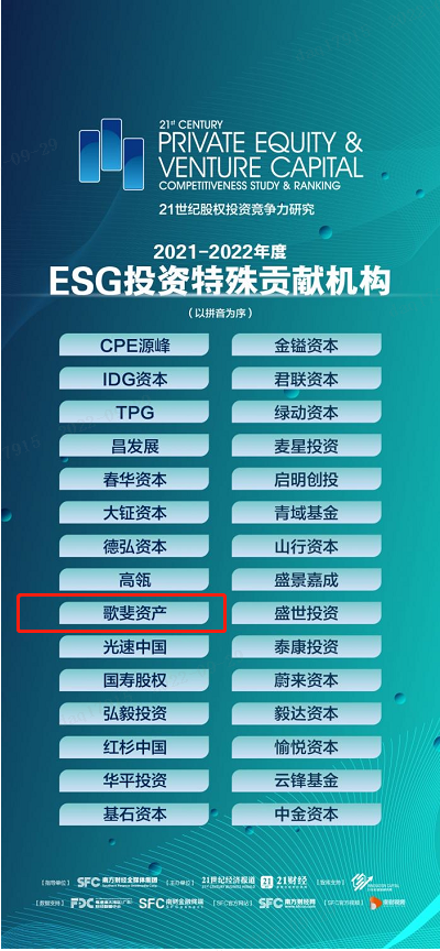 導(dǎo)語:在實現(xiàn)中國“2030 年碳達峰、2060 年碳中和”的目標(biāo)下,綠色低碳成為各個行業(yè)的必然要求和發(fā)展趨勢。9月28日,21世紀經(jīng)濟報道、21世紀創(chuàng)投研究院在北京舉辦2022年秋季閉門研討會——“踐行‘碳中和’:股權(quán)投資策略與實踐”,并在會上重磅發(fā)布了“2021-2022年度ESG投資特殊貢獻機構(gòu)”研究案例。歌斐資產(chǎn)深耕ESG領(lǐng)域,深度挖掘ESG投資趨勢,積極建立完善的ESG制度體系、健全ESG組織架構(gòu),以打造踐行ESG投資理念,在眾多參選機構(gòu)中優(yōu)勢突出,榜上有名。