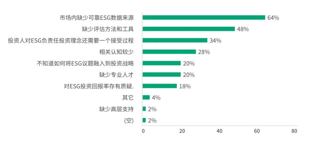 “歌斐資產(chǎn)2022年投資盡責行動報告”顯示:市場缺少可靠的ESG數(shù)據(jù)來源、投資人對ESG責任投資理念的接受需要過程,這成為中國開展ESG投資的前兩大挑戰(zhàn)。另外,目前ESG相關(guān)評價標準不統(tǒng)一也成為踐行ESG的一大挑戰(zhàn)。