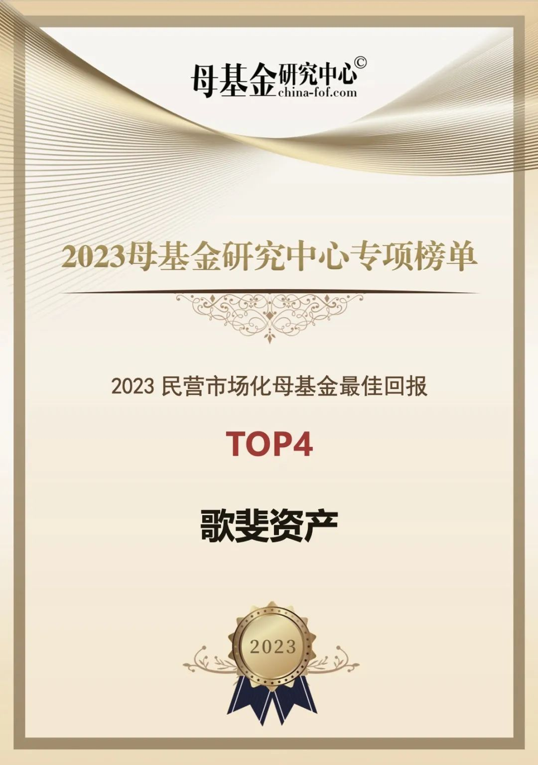 歌斐資產(chǎn)憑借出色的表現(xiàn)獲得“2023民營市場化母基金最佳回報(bào)TOP4”。
